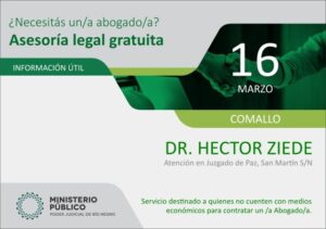 Este jueves 16 de marzo, dando inicio al cronograma de la Defensa pública en la Tercera Circunscripción, el Defensor Civil, Héctor Ziede se constituirá en el Juzgado de Paz de la localidad de Comallo ubicado en calle San Martín S/N, a partir de las 9:00 horas; donde recibirá consultas de la comunidad.