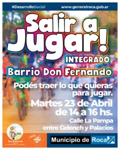 General Roca – El próximo martes 23 de abril se realizará un nuevo “Salir a jugar” en Roca, organizado entre el Municipio de General Roca, el CONyA y la Red Argentina de Ciudades de Niñas y Niños.