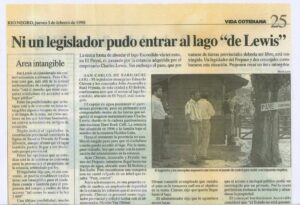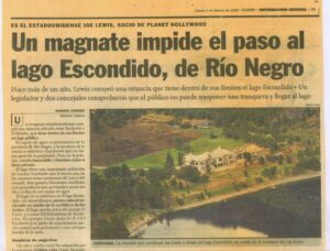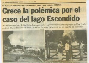“El 5 de febrero de 1998 alertados por algunos vecinos de la zona fuimos con el legislador provincial, Eduardo Chironi, el concejal de El Bolsón, Raúl Prytula, y un grupo de periodistas a la tranquera de la estancia de Joe Lewis para verificar que el camino de acceso al lago Escondido tenía cerrado el paso” señaló Accavallo sobre lo que ocurrió en ese momento.