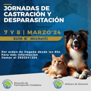 La Jefatura de Zoonosis y la Dirección de Participación Ciudadana informan que el próximo jueves 7 y viernes 8, a partir de las 8:00 en el SUM del barrio Michelli de San Antonio Oeste se llevarán adelante jornadas de castraciones masivas y desparasitación interna/externa, destinadas a perros y gatos.
