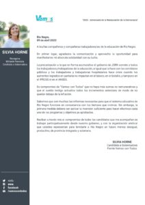 Reciban a través mío el compromiso de todxs los candidatxs que me acompañan de trabajar participativamente desde nuestro gobierno, y con la organización sindical que ustedes representan para brindarle a Río Negro un futuro menos desigual, productivo, de provincia integrada y soberana.