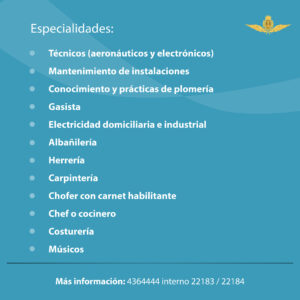 Además, cabe destacar que aquellos interesados que no posean algunos de los conocimientos antes mencionados, podrán inscribirse para la especialidad Seguridad y Defensa, convirtiéndose en los custodios de las unidades de la Fuerza Aérea Argentina.