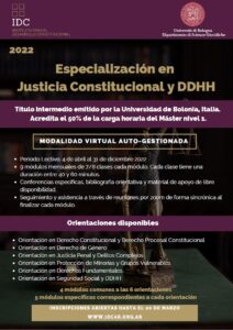 La aprobación de la especialización acredita el 50 % de la carga horaria de la cohorte 2023 del Máster en Justicia Constitucional y Derechos Humanos, que dicta la Universidad de Bologna y que tiene validez en toda la Unión Europea.