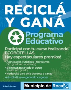En este 2025 “Reciclá y Ganá” renueva la propuesta dirigida a alumnos de nivel inicial, primario y medio de Roca, bajo la consigna de recolectar ECOBOTELLAS.