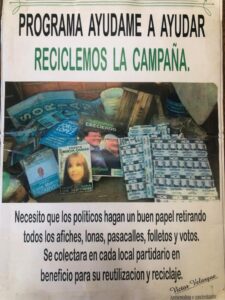 El vecino sanantoniense expresa en su campaña, “necesito que los políticos hagan un buen papel retirando todos los afiches, lonas, pasacalles, folletos y votos, para ser recolectados en cada local partidario y ser reciclado”.