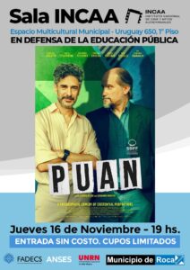En el marco de la proyección de la película “PUAN” en Sala INCAA de Roca, el próximo jueves 16 de noviembre se llevará adelante una actividad en Defensa de la Educación Pública junto a Universidades y Organismos Nacionales.