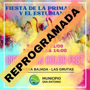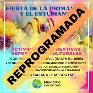 Atento a las condiciones climáticas pronosticadas para este sábado 21 de septiembre, el Municipio San Antonio informa que las actividades programadas al aire libre con motivo de los festejos del día de la primavera y el estudiante, en la quinta bajada de Las Grutas, se postergan para el próximo domingo 29 de septiembre de 2024, a partir de las 14.00 hs como así también baile al ritmo de comerciales y bachatas en Plaza Centenario a partir de las 15.00 hs.