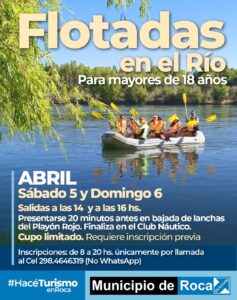 El Municipio de Roca, a través de la Dirección de Turismo, ofrecerá salidas en balsa durante el próximo fin de semana, para disfrutar la experiencia de navegar el río mediante un guiado interpretativo y la contemplación del paisaje natural.