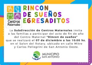 Por otra parte, con los centros de San Antonio Oeste, será primero el turno de “Ardillitas Traviesas” a las 8:00 hs en la sede del centro maternal, ubicada entre calles José Arburú y Juan P. Vera. A las 10:00 hs será el acto de “Rincón de Sueños”, en el Salón del Rotary ubicado entre calles Pellegrini y Mitre.