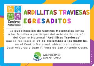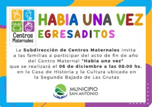 La Subdirección de Centros Maternales, dependiente de la Secretaría de Desarrollo Social, comunica que el miércoles 6 y jueves 7 de diciembre, se llevarán adelante los actos de fin de año de los jardines “Había Una Vez”, “Ardillitas Traviesas” y “Rincón de Sueños”.