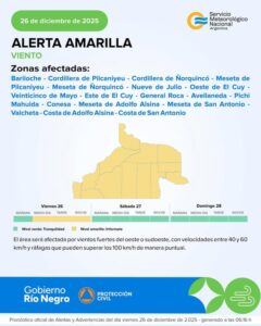 El área será afectada por vientos fuertes del oeste o sudoeste, con velocidades entre 40 y 60 km/h y ráfagas que pueden superar los 100 km/h de manera puntual.