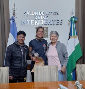 La deportista local, que cosechó 4 medallas y tres récords nacionales, fue recibida por familiares y allegados en la Municipalidad donde el Director de Deportes, Gustavo Montiel y la Directora de Coor. Institucional, Eventos, Ceremonial y Protocolo, Miryam Rogga, hicieron la entrega de un presente.