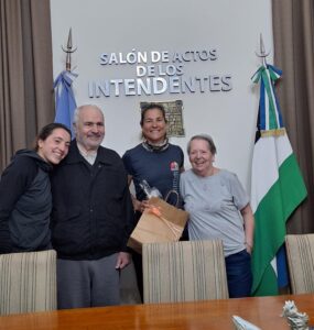 La deportista local, que cosechó 4 medallas y tres récords nacionales, fue recibida por familiares y allegados en la Municipalidad donde el Director de Deportes, Gustavo Montiel y la Directora de Coor. Institucional, Eventos, Ceremonial y Protocolo, Miryam Rogga, hicieron la entrega de un presente.