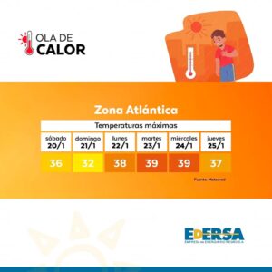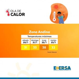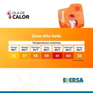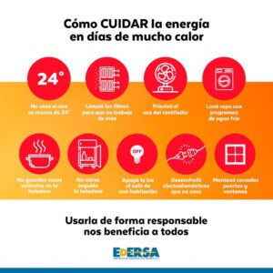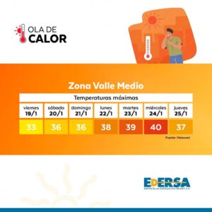 Hacé siempre un uso racional y eficiente de la energía, recordando que durante estos períodos de extremo calor se conjugan variantes que ponen a prueba el sistema: utilización permanente de artefactos de refrigeración en viviendas y comercios; inminente inicio del fuerte de la actividad frutícola, durante una cosecha que se espera próspera; recalentamiento de instalaciones eléctricas producto de la acumulación de días con temperaturas muy altas.