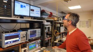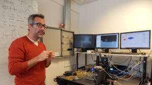 A través de un trabajo que realizó el Departamento de Ingeniería en Telecomunicaciones del Balseiro para el diseño de la Red Troncal de Fibra Óptica de la provincia de Río Negro, el grupo de investigación que dirige Costanzo Caso entró en contacto con la empresa Slyloom, en Estados Unidos. “Para trabajos de comunicaciones ópticas nos relacionamos con esta empresa que está fundada por argentinos, que busca que los satélites se puedan comunicar entre ellos por láser y que luego la información sea retransmitida a la Tierra. El problema de los satélites de órbita baja es que dan muchas vueltas terrestres y entonces la visibilidad que tienen para las estaciones es de un tiempo corto. En cambio, todo el tiempo pueden estar viendo a un satélite geoestacionario con el que se podrían comunicar y así poder dar cobertura en forma continua. Entonces, trabajamos en una solución con esta empresa para hacer el enlace de satélites de órbita baja con uno de órbita geoestacionaria. Desarrollamos un prototipo que emula ese enlace en el laboratorio, con una transmisión de información de 20 gigabits por segundo. No está hecha la aplicación todavía porque hay muchos aspectos que ver antes de poder ponerlo en un satélite, como solucionar problemas de vibración, de apuntado y demás. Nosotros trabajamos con el hardware y la parte física más que con los protocolos. Usamos luz infrarroja de banda X y vamos variando la frecuencia, la fase, la polarización y así podemos enviar más información en menos tiempo. Todavía es un prototipo de laboratorio”, dijo Costanzo Caso.
