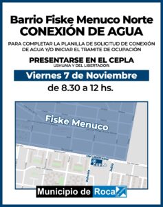 General Roca. – Teniendo en cuenta que la obra de abastecimiento de agua potable en barrio Fiske Menuco Norte se encuentra en etapa final, se solicita a los vecinos y vecinas que aún no han concluido el trámite de solicitud de conexión del servicio, que lo realicen a la brevedad posible.