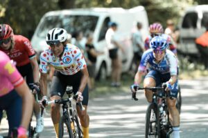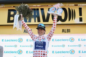 El ritmo es muy rápido. Solo hay una treintena de jinetes en la cima de la colina de Najac, atravesados en cabeza por Yara Kastelijn (Fenix-Deceuninck). La holandesa, ganadora la víspera en Rodez, vuelve así al nivel de Anouska Koster en la clasificación de montaña antes de adelantarla en la Côte de Laguépie (3ª categoría), para luego tomar un 4º punto de ventaja al pasar 2ª en la cima de la Côte de Monestiès (4ª categoría).