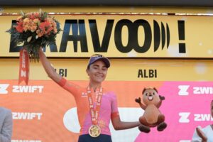 Bajo la primera manga de este Tour de France Femmes con Zwift, la 5ª etapa entre Onet-le-Château y Albi fue escenario de una batalla constante. La primera escapada, 11 ciclistas fuertes, nunca contó más de un minuto por delante, y el pelotón se hizo añicos en las tres subidas que marcaron la segunda mitad de la ruta. Aprovechando el desorden reinante en el grupo del maillot amarillo, reducido a una treintena de unidades, Ricarda Bauernfeind (Canyon//Sram Racing) encontró la apertura a 36 km de la meta. Su audacia dio sus frutos. La escaladora alemana de 23 años ganó en solitario con una ventaja de 22″ sobre Marlen Reusser (SD Worx) y Liane Lippert (Movistar), que se había escapado en la inmersión hacia Albi, y 32″ en el primer pelotón establecido por Lotte Kopecky (SD), todavía con el maillot amarillo antes de las últimas tres etapas.