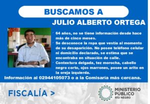 Bariloche.-Se reitera desde el Ministerio Público Fiscal la solicitud de colaboración de todos aquellas personas que puedan aportar datos a la investigación iniciada para dar con el paradero de Julio Alberto Ortega, 64 años de edad, de quien no se tiene información desde hace más de cinco meses.