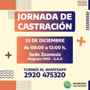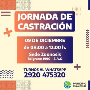 Desde Zoonosis Municipal te invitamos a aprovechar las tres fechas de castraciones gratuitas que se realizarán en la sede de San Antonio Oeste, ubicada en Belgrano 1990: