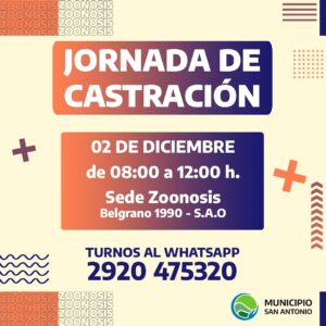 Desde Zoonosis Municipal te invitamos a aprovechar las tres fechas de castraciones gratuitas que se realizarán en la sede de San Antonio Oeste, ubicada en Belgrano 1990: