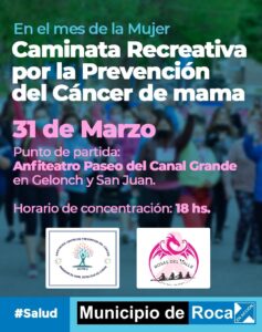 General Roca. -Se recuerda que, el Municipio junto a CEPREC y Rosas del Valle, organiza para el día viernes 31 de Marzo, una caminata libre, gratuita y solidaria en el marco del mes de la mujer.