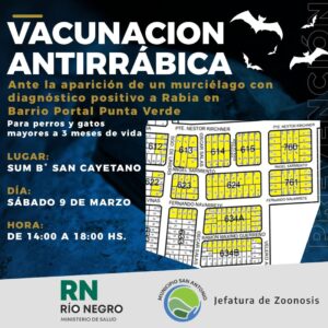 El área de zoonosis del Municipio San Antonio en conjunto a Salud Pública llevarán a cabo una campaña de vacunación antirrábica el día Sábado 9 de Marzo del corriente año, desde las 14 a 18 hs, y por la mañana habrá equipo vacunador recorriendo la zona.