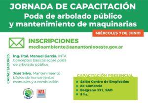 La Agencia de Protección Ambiental Bahía San Antonio y la Secretaría de Servicios Públicos informan que el próximo miércoles 07 de junio se llevará adelante una jornada de “Capacitación de poda de arbolado público y mantenimiento de maquinarias” destinada a agentes municipales y público en general.