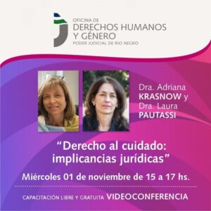 La disertación estará a cargo de las Doctoras Adriana Krasnow y la Dra. Laura Pautassi. Se llevará a cabo de 15 a 17 horas y está destinada a todas las personas que se desempeñan en el Poder Judicial y público en general.