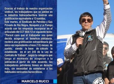 A partir de la firma de un acuerdo con las cámaras empresarias, el Sindicato de Petróleo y Gas Privado de Río Negro, Neuquén y La Pampa, logró que cada trabajador que se jubile pueda acceder a la gratificación de 13 sueldos sin mayores trámites.
