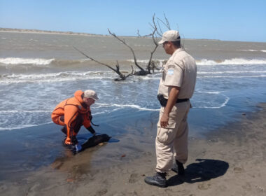El animal había varado en la playa, cerca del estuario del río Negro. Personal de la Prefectura Naval Argentina ayudó a un pequeño delfín a regresar a su hábitat natural, luego de encontrarlo varado en la playa en Río Negro.
