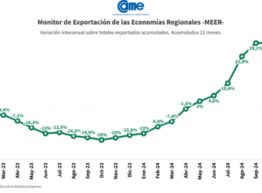 De acuerdo con el Monitor de Exportaciones de las Economías Regionales (MEER) elaborado por la Confederación Argentina de la Mediana Empresa (CAME), el mes de octubre terminó con un incremento en las exportaciones de las economías regionales del 29,3% en dólares y 23,4% en toneladas, lo que representa una suba […]