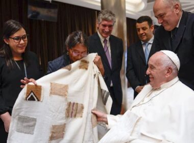 El Papa Francisco recibió días atrás un manto diseñado por Manuela Rasjido, con apliques de 42 piezas textiles elaboradas por 34 tejedores de Argentina. Uno de los módulos fue realizado por la artesana Georgina Calfuqueo, de la comunidad Aucapan de Junín de los Andes.