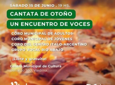 Con la participación de diferentes coros de Viedma, este sábado 15 de junio a las 19 en el Hall del Centro Municipal de Cultura se realizará una Cantata de Otoño, un Encuentro de Voces, con la actuación del Coro Municipal de Cultura, el Coro del Centro Cultural Ítalo Argentino de […]