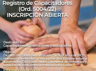 Se recuerda que se encuentra abierta la inscripción para el Registro Municipal de capacitadores/as, instituciones y asociaciones habilitadas para el dictado de Cursos de Reanimación Cardiopulmonar (RCP), Maniobra de Heimlich y Manejo de Desfibrilador Externo Automático (DEA) destinados a personal de comercios y espacios de concurrencia masiva de la ciudad.