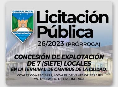 La Municipalidad de General Roca, prorroga la fecha para la presentación de ofertas correspondiente a la Licitación Pública Nº 26/2023 correspondiente a la: “Concesión de la explotación de 7 (siete) locales con destino a ventas de pasajes, despacho de encomiendas y comercios en general, todos ellos ubicados en la terminal […]