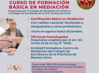 Lo organizan en conjunto el Colegio de Abogados de Viedma y el Centro de Mediación del Colegio de Escribanos de Buenos Aires. Va destinado a abogadas/os y profesionales de otras disciplinas. Habilita para obtener la matrícula del Poder Judicial de Río Negro.
