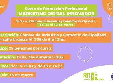 En el marco del programa Más Futuro, el próximo 13 de marzo en Cipolletti comenzará un nuevo curso de formación profesional sobre marketing digital innovador. En este sentido, ya se encuentran abiertas las inscripciones para las y los interesados.