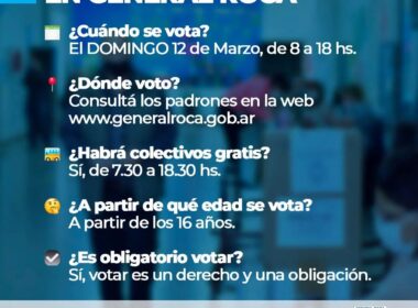 General Roca.-Con motivo de las Elecciones Municipales a realizarse el domingo 12 del corriente, el municipio dispuso que el servicio urbano de pasajeros desde y hacia todos los barrios de General Roca sea gratuito para facilitar el traslado de los vecinos que emitirán su voto.