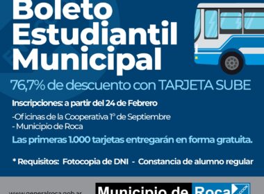 General Roca. -El Municipio de Roca otorgará un Boleto Estudiantil para residentes de la ciudad. Se trata de un descuento del 76,7% sobre el boleto.