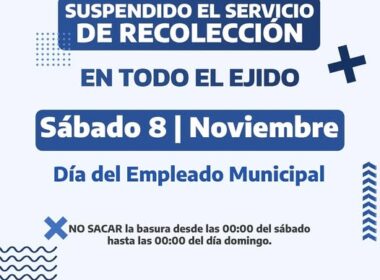 En el marco del Día del Empleado Municipal, que se celebra el 8 de noviembre, el Municipio San Antonio informa que se suspenderá el servicio de recolección de residuos en San Antonio Oeste, Las Grutas y el Puerto San Antonio Este.