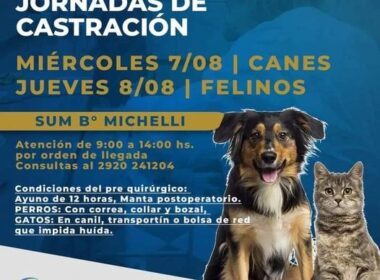 La Jefatura de Zoonosis, informa que el miércoles 7 y jueves 8 de agosto se llevarán adelante dos jornadas de castraciones destinada a perros y gatos. La misma tendrá lugar en el SUM del Barrio Michelli de 9:00 a 14:00 hs, por orden de llegada.