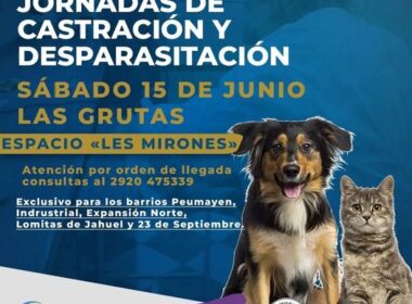 La Jefatura de Zoonosis informa que el sábado 15 de junio en el Espacio “Les Mirones” de Las Grutas se llevará a cabo la jornada de castración y desparasitación a partir de las 09.30 hs
