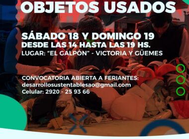 La Subsecretaría de Desarrollo Sustentable del Municipio San Antonio, comunica que el sábado 18 y domingo 19 de mayo, de 14:00 a 19:00 hs en “El Galpón” (Victoria y Güemes, SAO), se realizará la Feria de Ropa y Objetos Usados la cual tiene su convocatoria abierta para aquellos que quieran […]