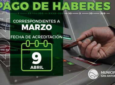 La Secretaría General de Coordinación Institucional y Gobierno del Municipio San Antonio, a cargo de Matías Hermo, informa que el martes 9 de abril estarán disponibles los salarios correspondientes al mes de marzo para la administración pública municipal.