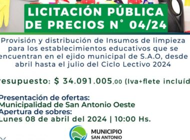 El Municipio San Antonio realiza el Llamado a Licitación Pública N°002/2024, que tiene por objeto “provisión y distribución de Insumos de limpieza para los establecimientos educativos que se encuentran en el ejido municipal de San Antonio Oeste, desde el mes de abril hasta el mes de julio del Ciclo Lectivo […]
