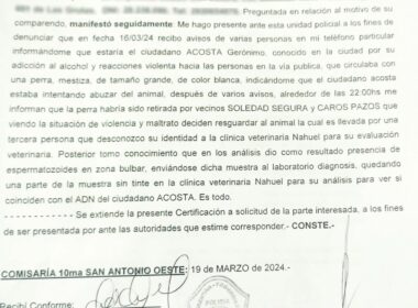 A través de la Jefatura de Zoonosis, a cargo de Ada Nahuelhual, el Municipio San Antonio realizó una nueva denuncia por maltrato animal al ciudadano Gerónimo Acosta, tras recibir avisos de vecinos informando que dicha persona circulaba con una perra de color blanca dando indicios de abuso al animal.
