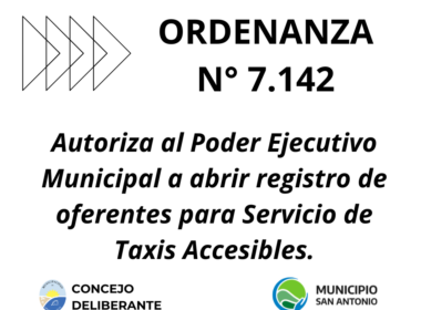 El Concejo Deliberante aprobó por unanimidad en la Sesión Ordinaria del día 26 de Enero de 2024 , la Ordenanza N° 7.142, la cual autoriza al Poder Ejecutivo Municipal a abrir registro de oferentes para la prestación del servicio de taxis “A” (accesible), vehículos adaptados para personas con movilidad reducida […]