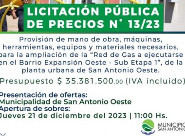 El Municipio San Antonio realiza el Llamado a Licitación Pública N°013/2023, que tiene por objeto la provisión de mano de obra, máquinas, herramientas, equipos y materiales necesarios, para la ampliación de la “Red de Gas a ejecutarse en el Barrio Expansión Oeste – Sub Etapa 1”, de la planta urbana […]