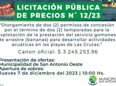 El Municipio San Antonio realiza el Llamado a Licitación Pública N°012/2023, que tiene por objeto el otorgamiento de dos (2) permisos de concesión por el término de dos (2) temporadas para la explotación de la prestación del servicio gomones de arrastre (“bananas”) para desarrollar actividades acuáticas en las playas de […]